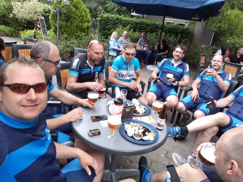 Nadien ging het richting huiswaarts, het is te zeggen richting Staminee. Daar zaten 4 andere dappere helden (Hans, Gunter, Niki en Jan) te wachten op ons. Zij hadden nl. naar Einhoven gefietst per koersfiets. Ook Berreke en Steven B kwamen onze après nog extra gezelligheid toebrengen.